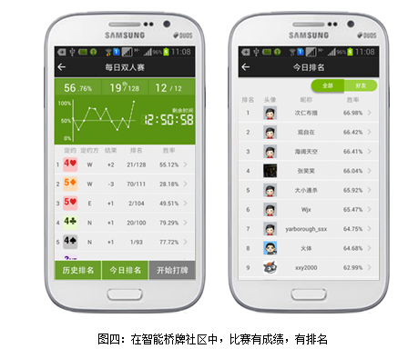 在社区中,桥牌爱好者可以参加不同的比赛,比如和机器人搭档一起参加一个十二副牌的双人赛,双人赛采用MP制或IMP制,社区随时给出参加比赛的排名,同学之间的比赛排名会增加比赛的竞争性和趣味性。