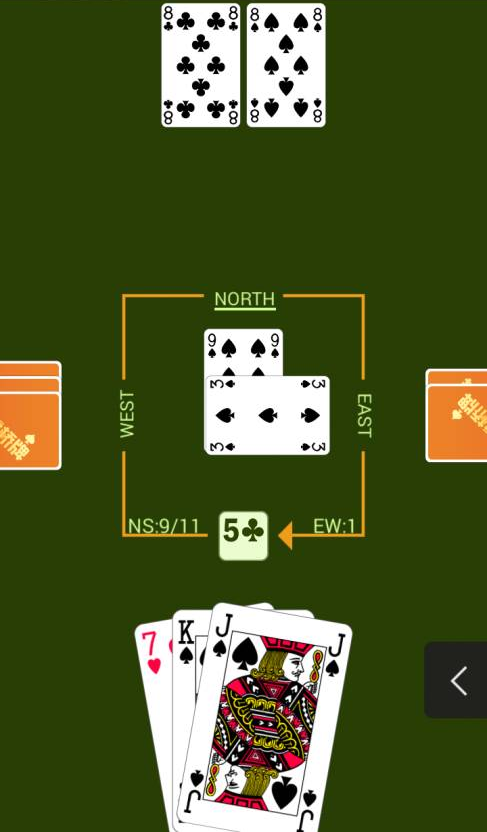 4、 黑桃A在谁手里?黒桃KJ结构,如果AQ都在西家必宕,二边分布的话,需要知道A的位置,才能只失一墩。敌方17个大牌点,已知西家红桃KQ,草花Q,7点,东家草花K,3点,打完方块剩3张牌,进一步探明,红桃J在西家,且西在第9轮垫了张黑桃5。至此,综合西家1H争叫、黑桃垫牌以及东家不垫黑桃三个信息,第10轮黑桃J飞东家Q成功!。